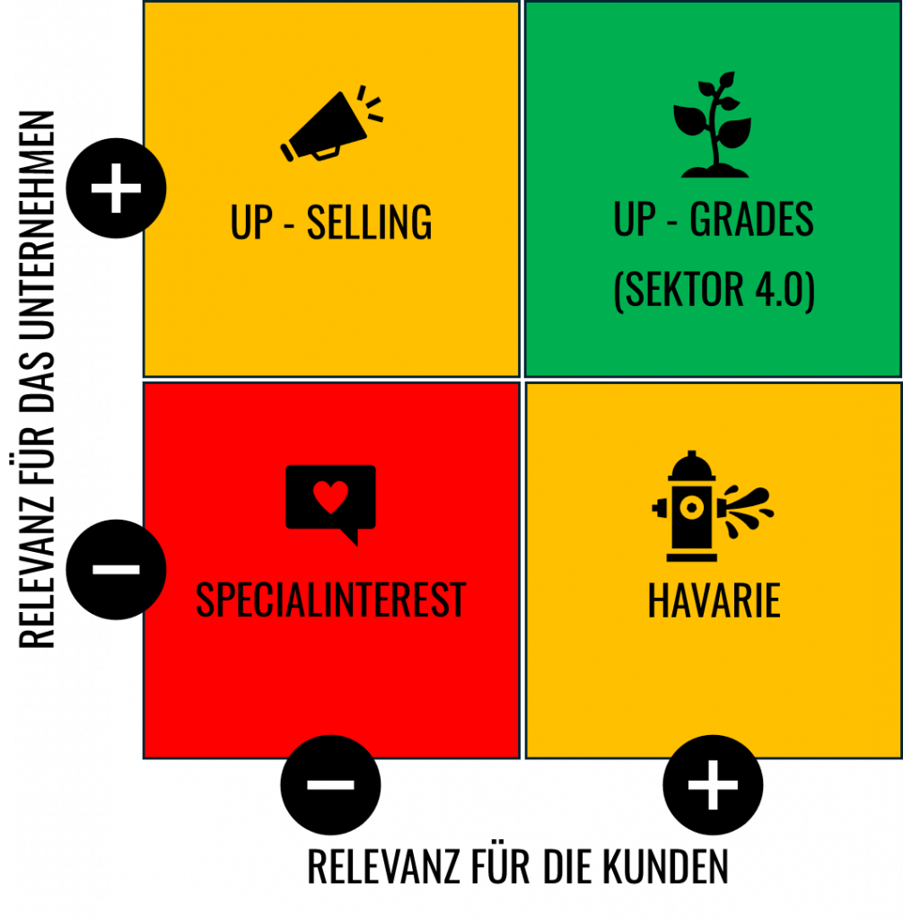 Der Sektor 4.0 entsteht, wenn man die Leistungen in eine Matrix bringt, die ein Unternehmen entlang seines Grundangebots im Bereich der Kundenbeziehung/Kundenkommunikation erbringt.